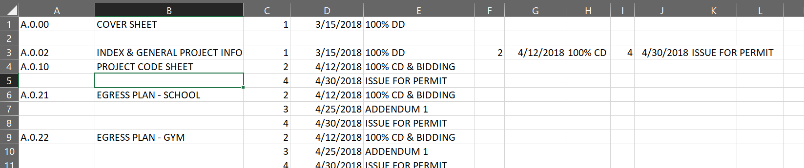 you’re just missing the last bit on how to get those revision rows below the first revision and sheet number/name - sometimes it helps to learn to make a small sample Excel file structured the way you’d like it, and use the Excel.ReadFromFile node to see exactly how you need to structure your data to write it properly. If you read this way you will see that each of the cells with blank values for columns A and B read as nulls