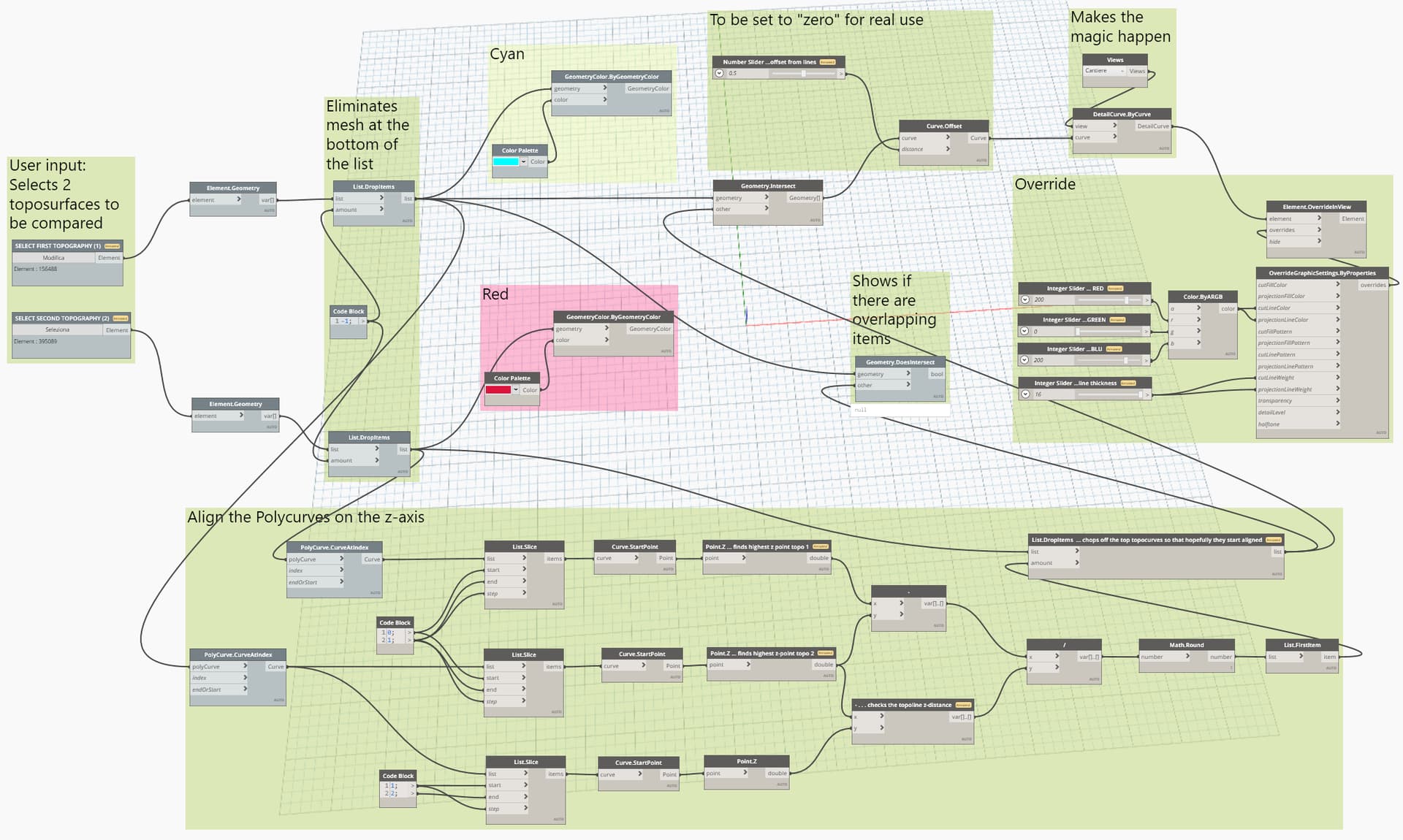 I made some progress…I need to find a way to auto-align the toposurfaces on the z-axis and need to find out how to insert the result presentable on the revit drawing.