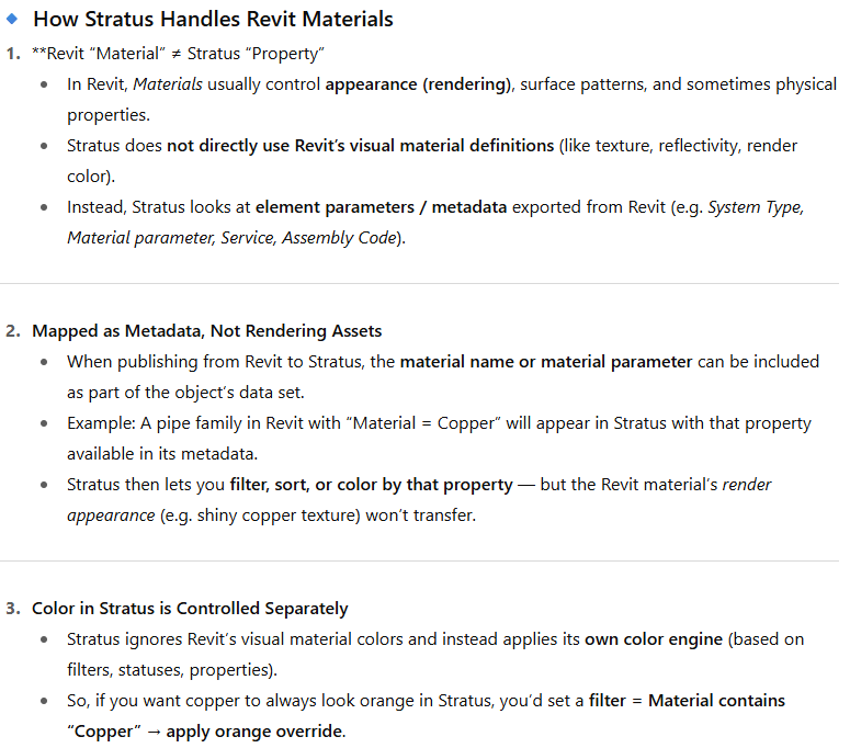 This is a huge assumption with no basis. It’s fair to say that Stratus probably has a way to identify colors from Revit similar to Navisworks, but if you’re looking for a default functionality that you can just pull from an exchange format of some kind, it’s probably not going to match exactly how Navisworks works.