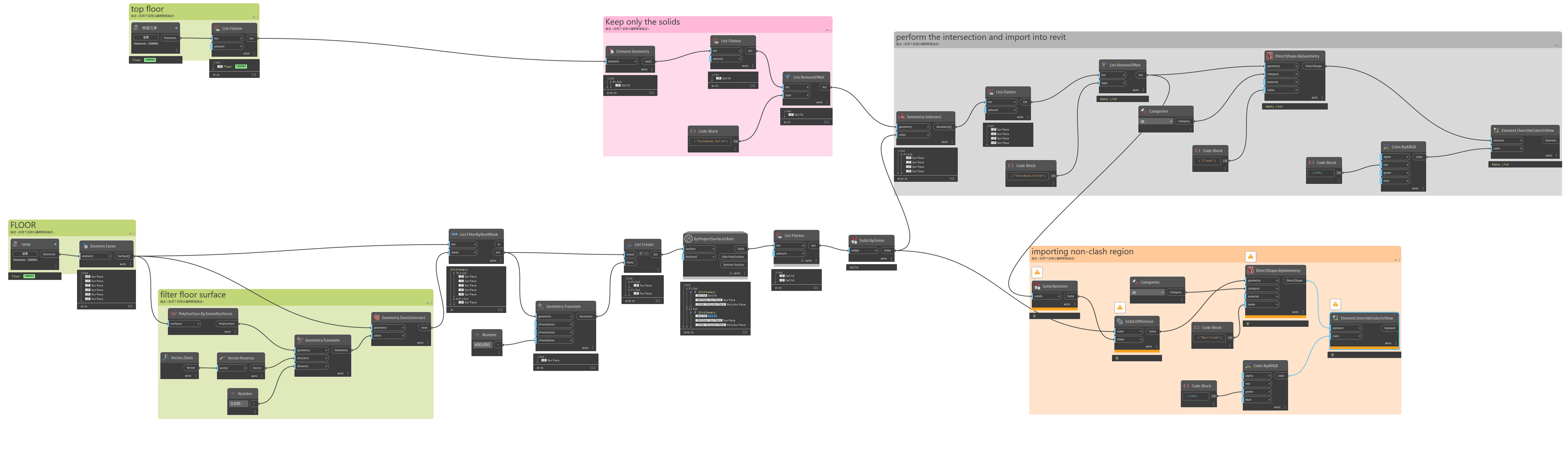 The resulting family instance can then be updated (leverage element binding or build new families) and used for clash detection in Navisworks, Revit’s own InterferanceChecker, ACC Moodel Coordiantion, or used in Dynamo as subsequent “element intersects element” selections.