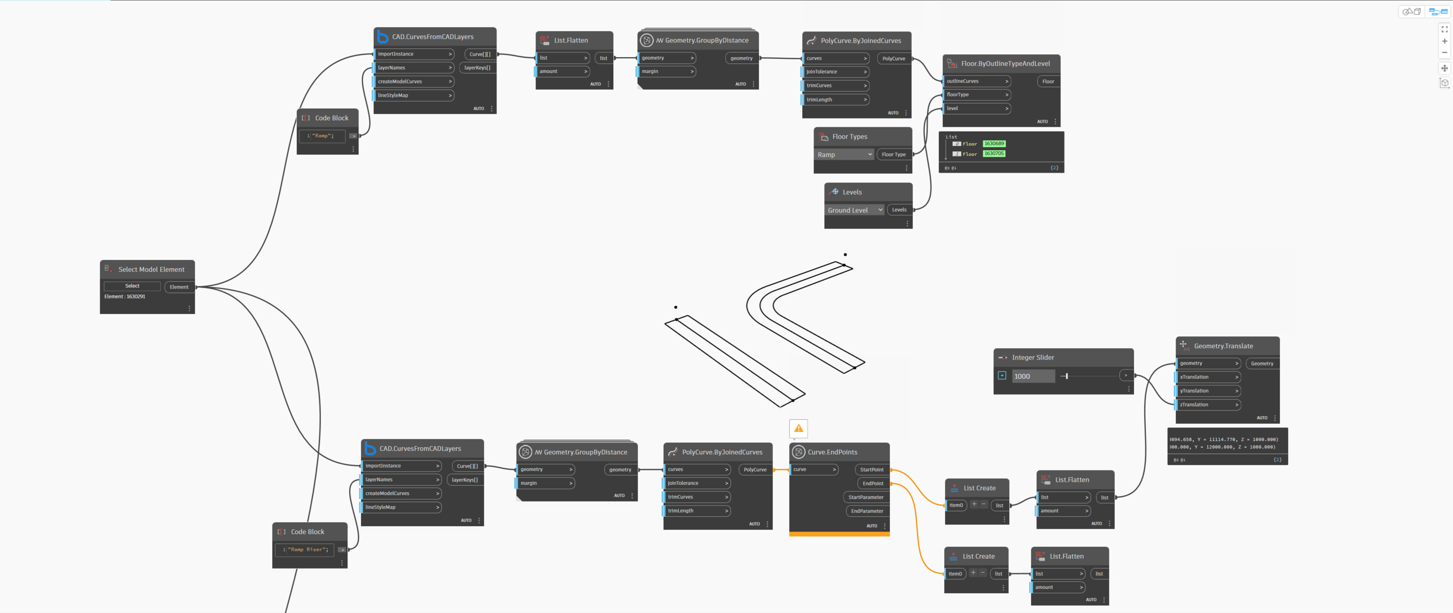 I’m trying to extract the center line of a ramp, get its start and end points, translate the end point upward along the Z-axis, then construct a vector from the start point to this new translated end point. I then use this vector to translate a geometry (e.g. a floor), starting from the main level. However, the translation doesn’t seem to work, and I’m not sure why.
