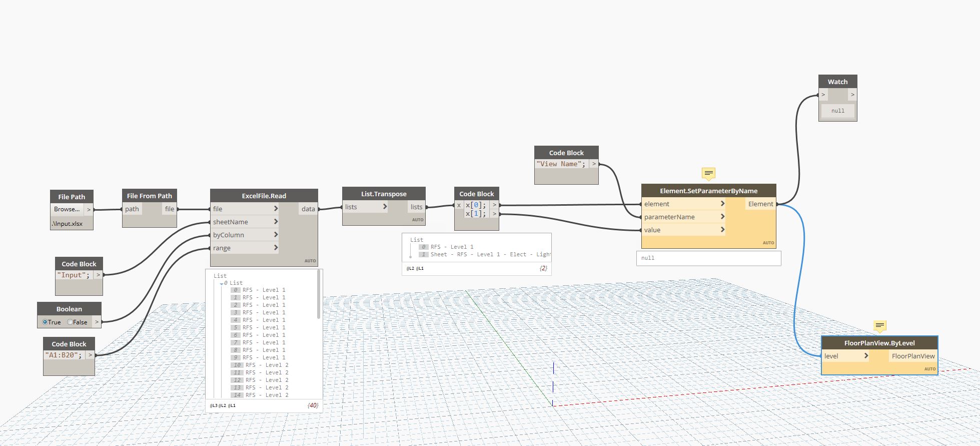 Assume you want to create a bunch of floor plans from a spreadsheet. The spreadsheet might have two columns - one for the view name and one for the associated level name. You would first create a Dynamo Script to read these two lists of strings in from the spreadsheet. Next, you would have to add to the script a section that takes the Level names and finds the associated Revit level elements (Archi-Lab package has a node called “Get Level By Name” that will do this for you). Now that you have a list of level elements, feed that into the “FloorPlanView.ByLevel” node to create all of the floor plan views. This will output the view elements that are created. Next, feed that list of created views into a “SetParameterByName” node, feed in a string “View Name” as the parameter to be set, and feed in the list of view name strings taken from excel as the parameter values. This will rename all of the views you just created to the values set in Excel. Note that you will need to ensure that none of the View name values in excel are identical as this will throw an exception. If you do want some views to have the same names on sheets, then you can set the parameter “Title on Sheet” instead.