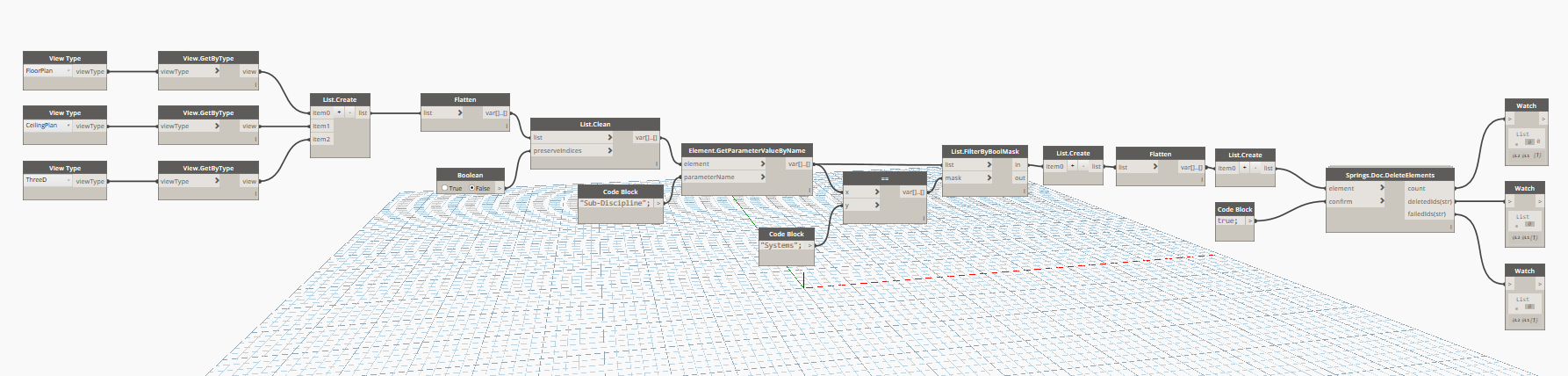 I am having issues with deleting my views, based on their sub-discipline name. My end-goal is to use the Data-Shapes package to create a dialog box, that will allow the project creator to batch-style remove all sub-disciplines in the setup file we don’t need. I have already done a similar script that will allow the project creator to delete Levels, Ref Planes, Scope boxes and Sheets Based on their (created parameter), “view-Sheet Type”. The other script is wildly successful for us, and I decided I wanted to expand the project setup abilities in Dynamo.