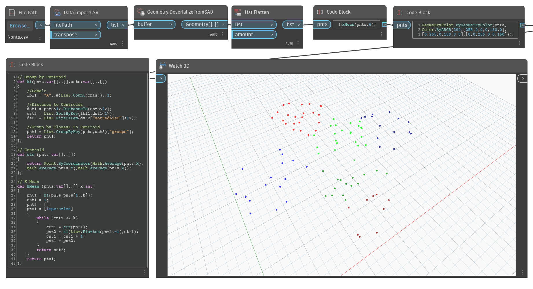 After the Dynamo teams persentation today on design script I got energized and dove back into Dynamo’s Imperative functions. I have had the goal for a few years to get Kmean to work in Design script with no luck. I got a bit closer today but still confused and not even sure if it is even possible.