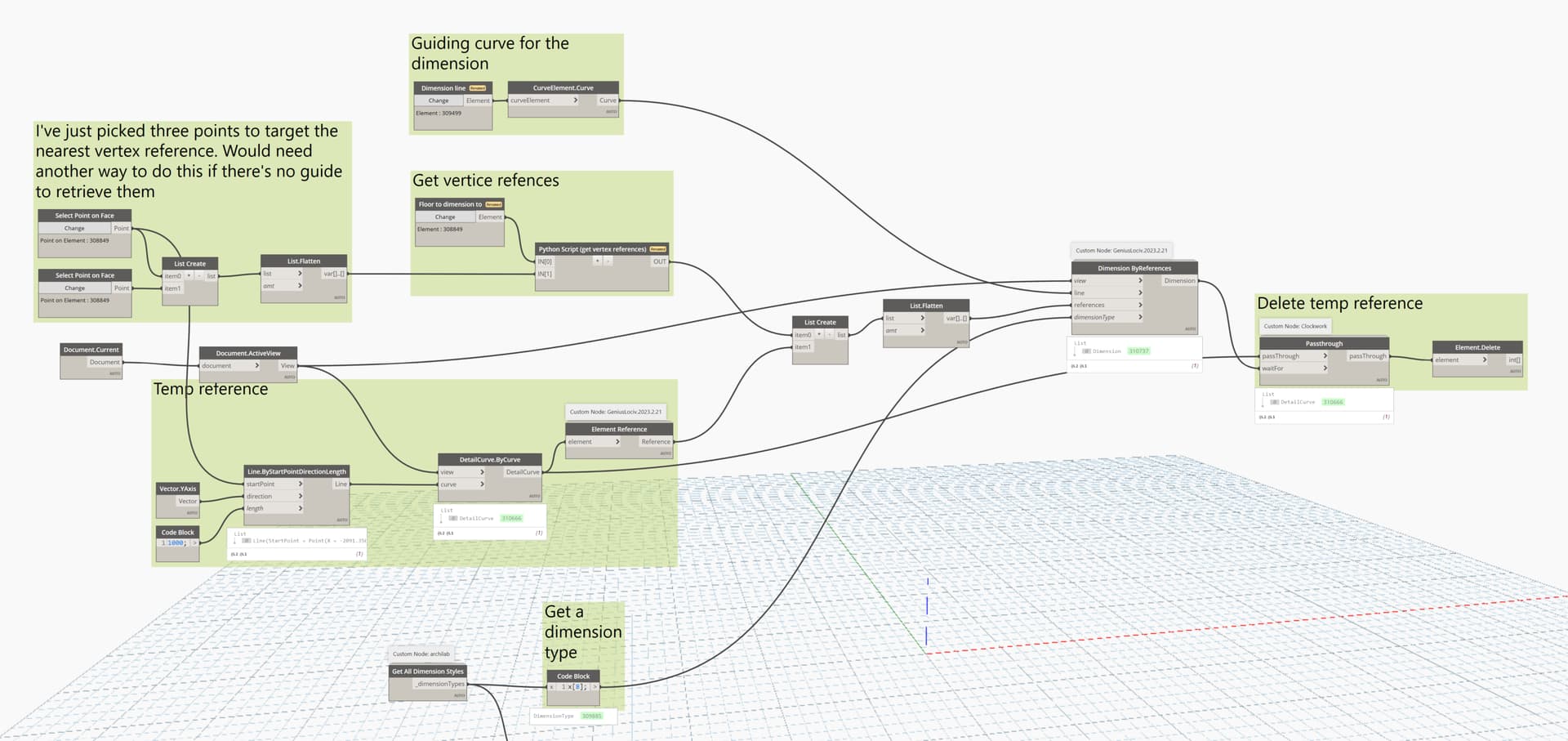 It is not the most elegant but it gets the job done. I’ve kept the create dimension node as-is (from Genius Loci). But I create a temporary detail line and add that as a reference. This forces a multi-segment dimension which is aligned correctly. Once created, the detail line is deleted and the dimension dynamically updated but most importantly, it keeps its orientation (even when manually moved). The dimension also remain associative, so if the element’s size changes, the dim will update.