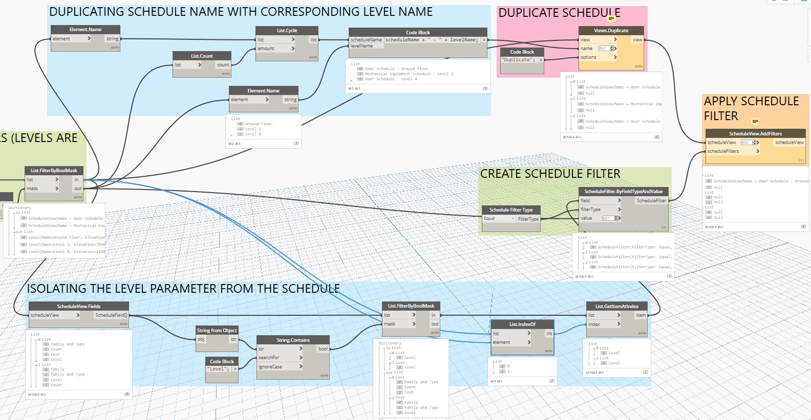 So, this is an interesting one to test out, for the view duplicate part, you need to create a view name for the other schedules, as of right now it’s just generating one view name for the first schedule in your list. In your code block, you can tell it to work at level 1 by inserting “@L1<1>” after the variable LevelName (LevelName@L1<1>). This will generate a view name for the additional schedules in your list for duplicating.