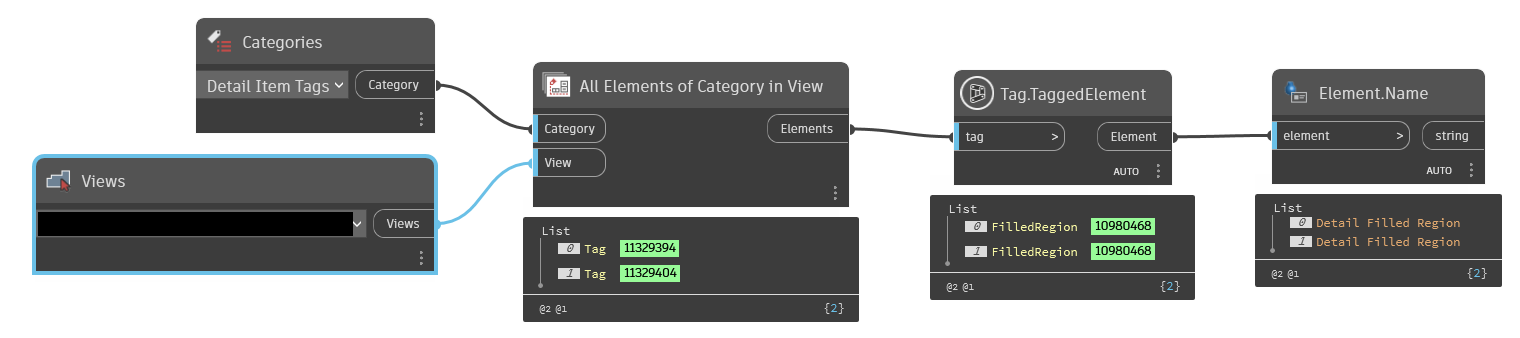 Do you see that the “Tag.TaggedElement” ID Values are the same? That means those 2 Tags are placed on the same object. You would need to isolate one of them, and delete the rest (in this case just 1, but there could be more than that). Once you have that sorted out, you can scale your graph to deal with multiple inputs, list levels and even multiple categories.