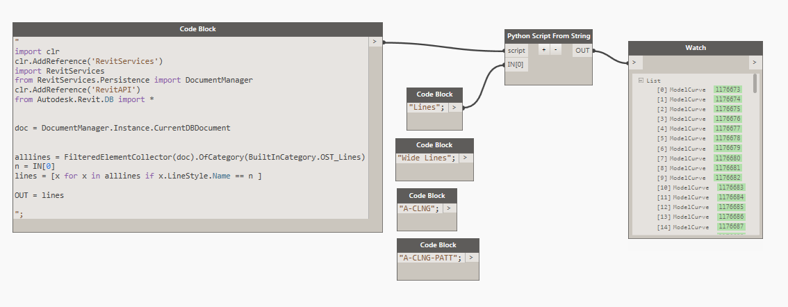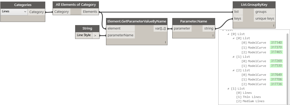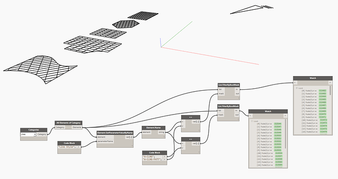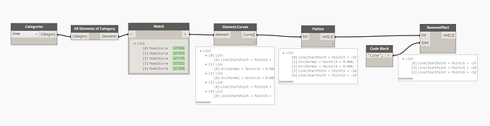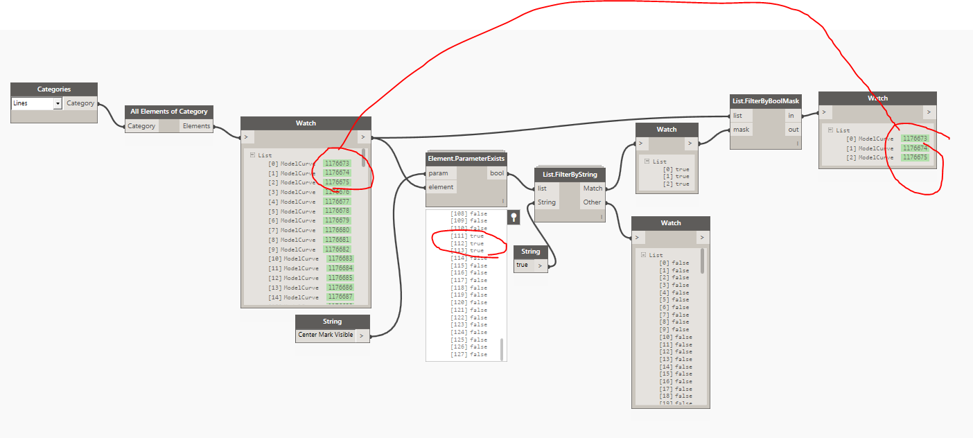 I need to separate curved model lines from straight ones into two separate lists so that I can run different nodes on each type of line. I noticed that curved lines have a parameter called “Center Mark Visible” That I was trying to use with the Element.ParameterExists node from the Clockwork package. Even though I can get the node along with List.FilterByString to create a list of just the curved lines, when I try to use the List.FilterByBoolMask it creates a list that from the first elements that only match the same quantity of of the curved lines and not the correct index of the curved lines.