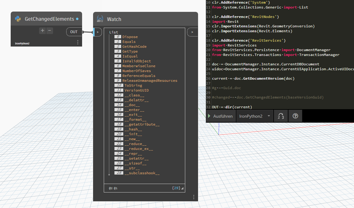 However, this won’t work on the deleted elements, as they no longer exist in the active document. Instead you’d have to pull them from the background opened document (which is why I thought keeping it in memory might be a good thing here). With the old document open in memory you can do soemthing like this: deletedElements = [oldDoc.GetElements(id) for id in deletedElementIds] which will give you full access to the elements with anything they may be able to do with them in the Python environment, and in some cases beyond as I am showing here (Revit 2024.1 with Dynamo 2.18):