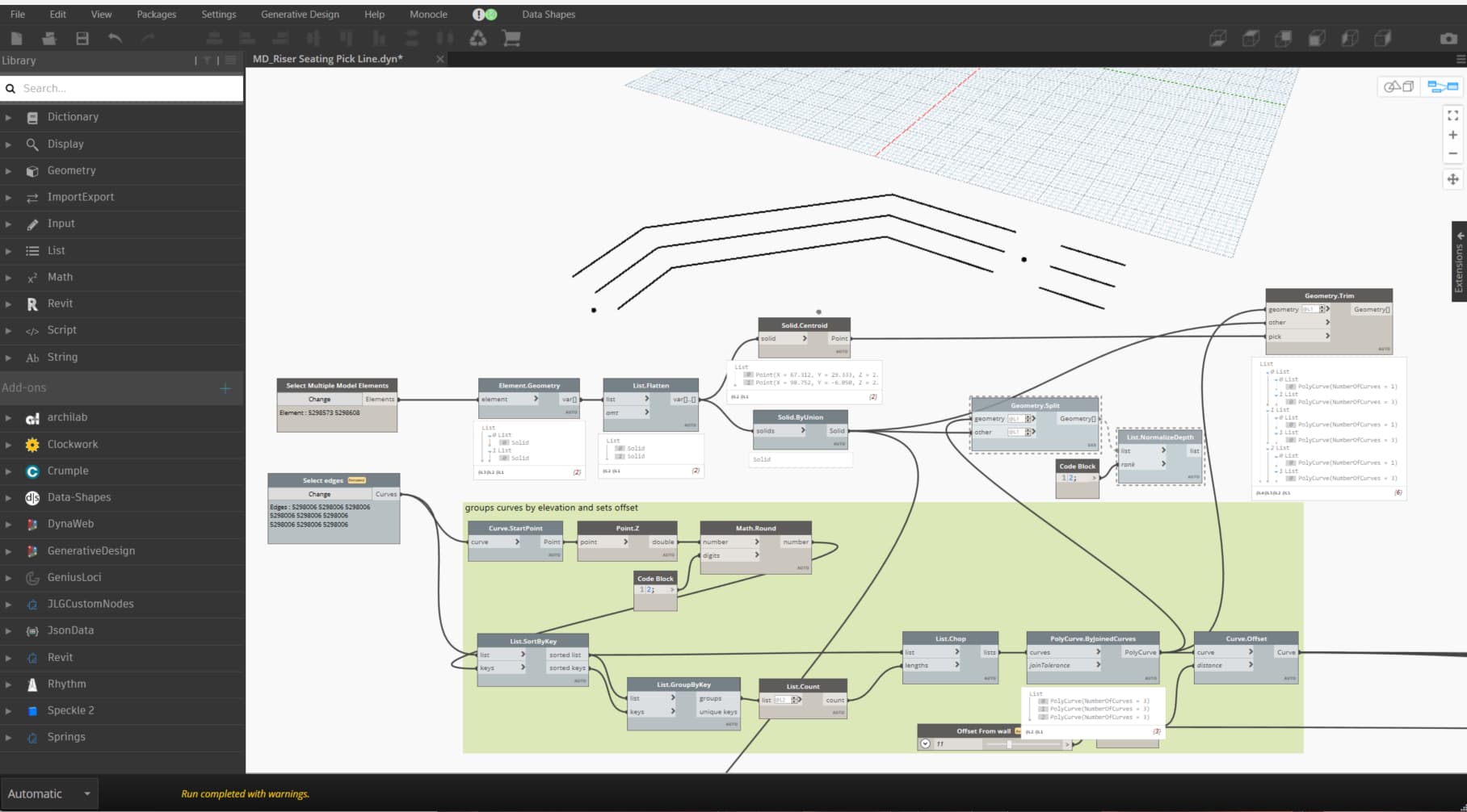 As the title says, I am trying to create a tool that will place seats by point along a polyCurve line and am having issues when trying to account for aisles. As the image shows, I am extracting a set of curves from a set of modeled risers and cutting them with some massing objects that represent the aisles.