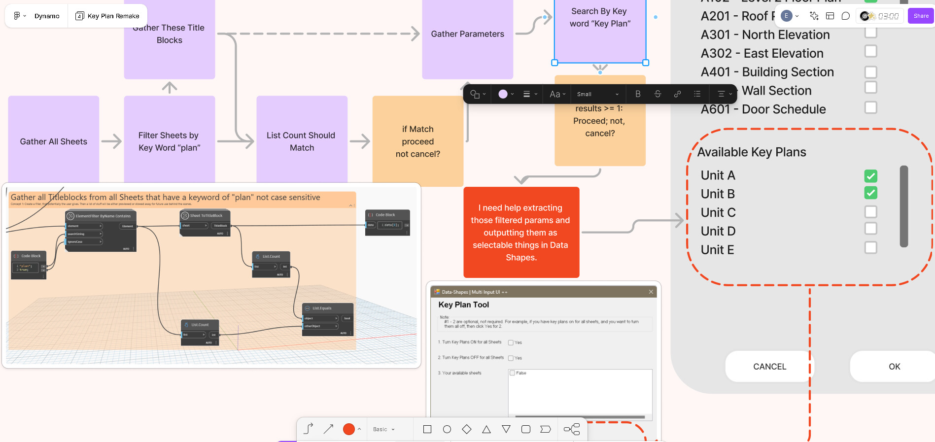 While I can successfully filter sheets by the keyword “Plan” and display them in a DataShapes UI for user selection, I’m struggling to do the same for the filtered title block parameters. I want to display these parameters as selectable items in a similar manner.