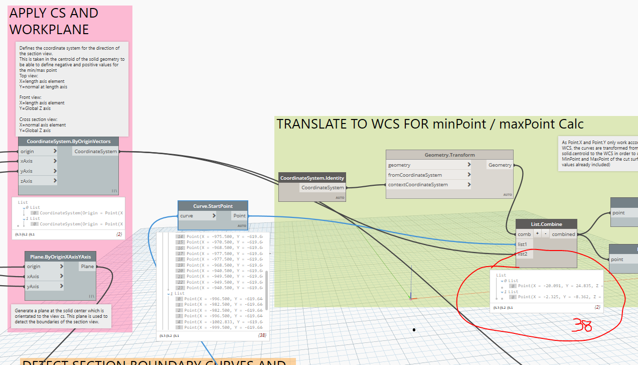 I would expect to have a list structure that matches exactly that of my curve start point list (2 total lists with 38 individual entries like in the screen shot below), like I get when I do this on a single part. I was thinking that maybe controlling the levels on this node would solve this problem, but list.combine node does not allow for level control? Never experienced this before on a node; I have not used list.combine at all before.