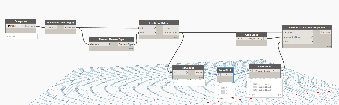 Ok, then you need to find those elements (maybe Category - Windows and all elements of category), then use GetParameterValueByName (name: family and type), then on that value use Unique items and SetParameterByName (name: POLO_C_keynote, Value: keynotes).