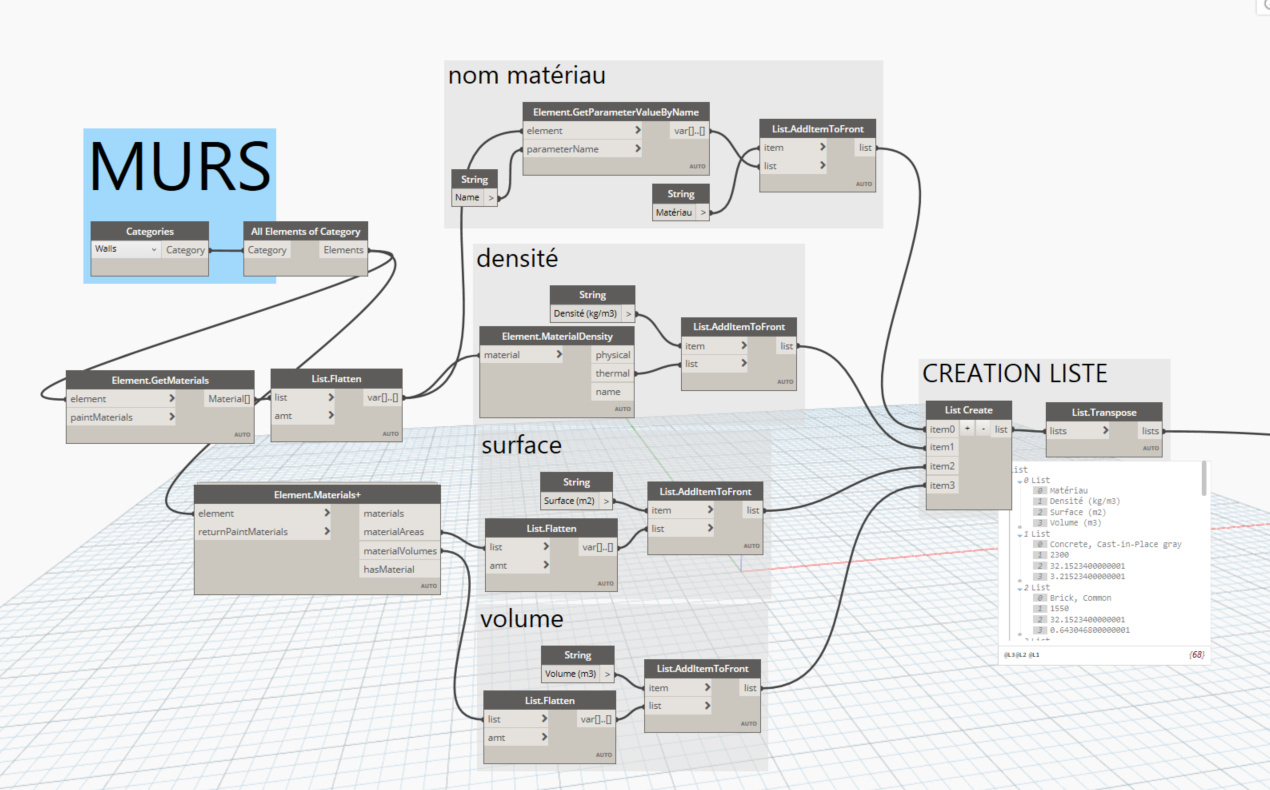 I am trying to export some materials information to an Excel file. Here I can get the name, the density, the area and the volume of all the materials that are in the walls.