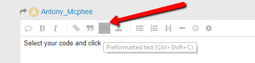 Select your code and click Ctrl+Shift+C or press the button preformatted text