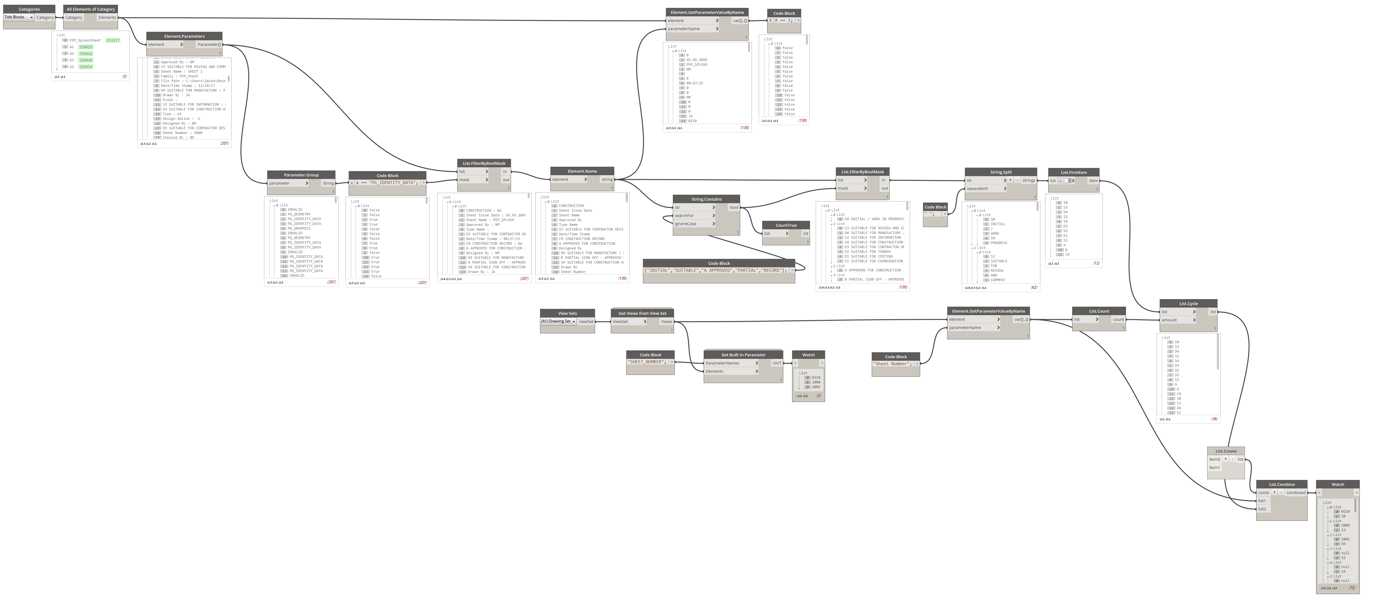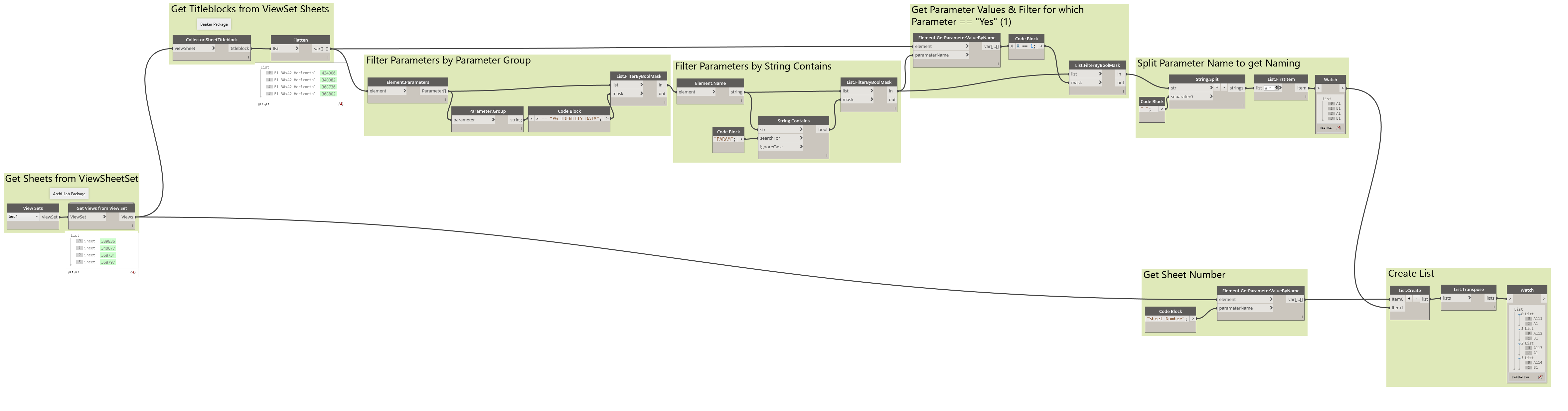 Your graph doesn’t show how you are getting the Sheet Numbers from your ViewSet sheets, but a couple of custom package nodes could help your graph to be more streamlined (pictured below Archi-lab and Beaker nodes)