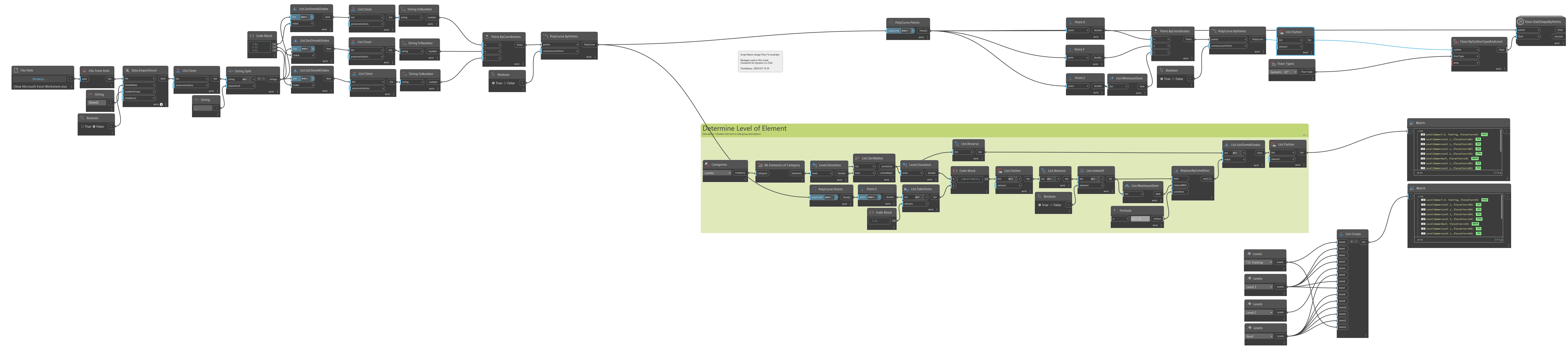 I have a graph (attached) that is taking some polycurves and generating floor in Revit. There are 2 parts to the graph, creating the floor and another that is looking at the Z value of points and determining the level that the new floor should be hosted. The problem that I am running into is when I wire in the determined levels, Revit and Dynamo both hang causing the spinning wheel of Death. If I generate a list of levels manually and wire this in, the graph runs just fine. I thought that it may be that the levels have not yet been determined when the floors are created. I tried using a passthrough node, but experienced the same results of Revit locking up. The list of levels looks the same, visible in the attached image. Any idea on how to fix/debug this?