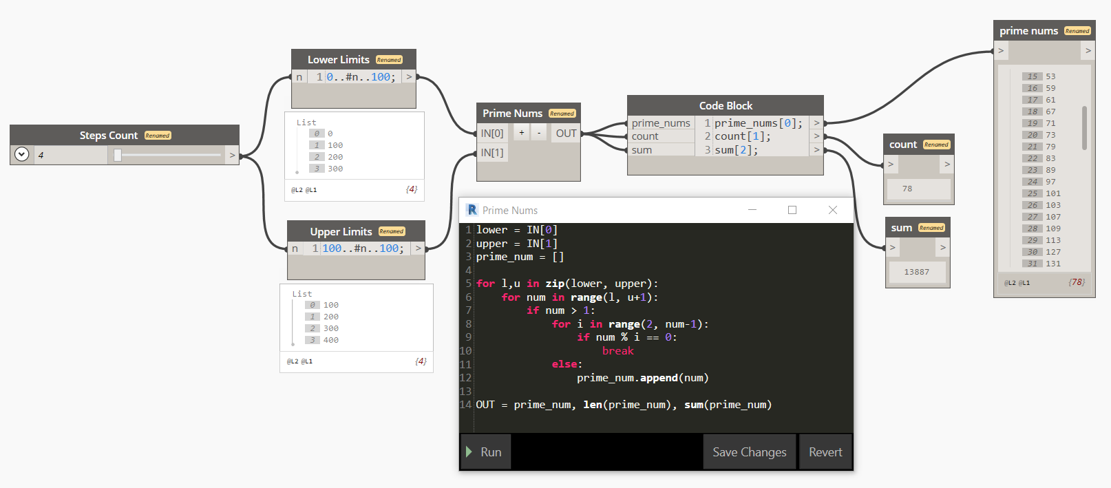 I am just trying basic python to find prime numbers between a range (lower and upper). But I couldn’t quite get the output in the form of list levels… I want the output lists (prime nums, count, sum) to be nested lists of the same lengths.