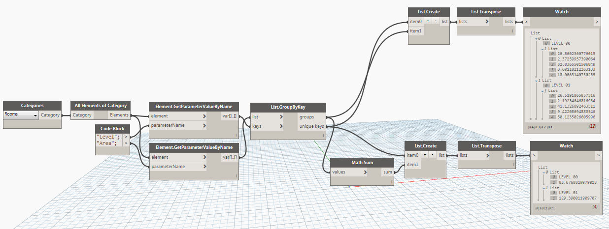 Hi I am new to dynamo and I am trying to calculate the Area of all rooms per their respective level. Below is a quick example of where I am stuck: