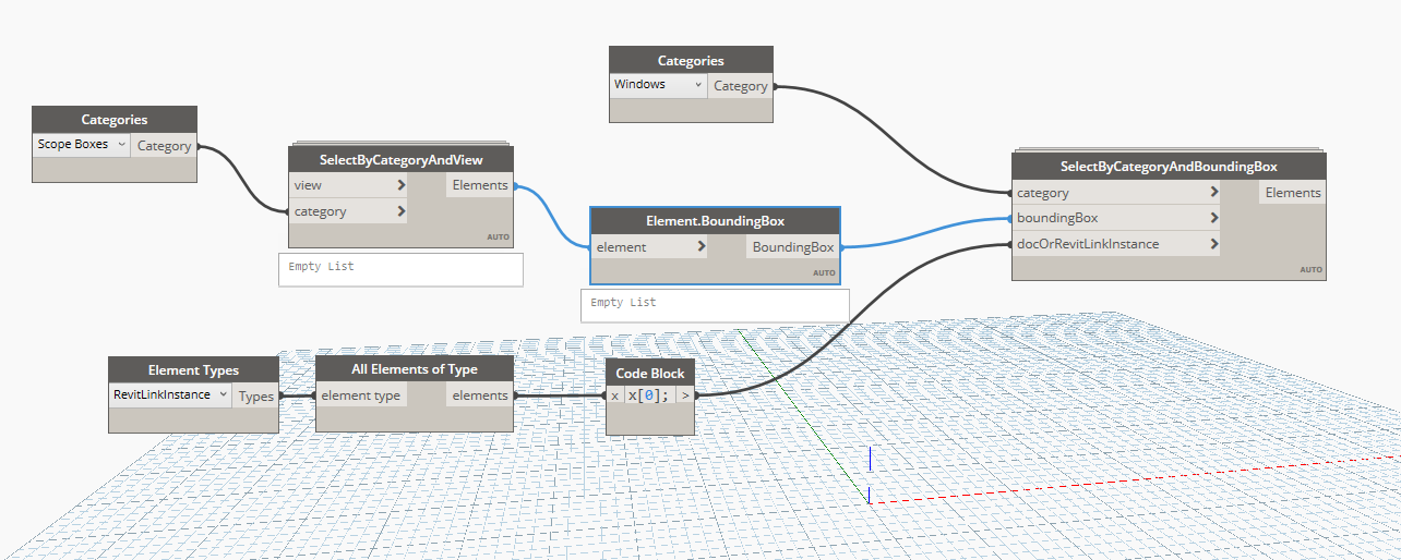 In this configuration, the SelectByCategoryAndView node use the active view to collect the scope box.