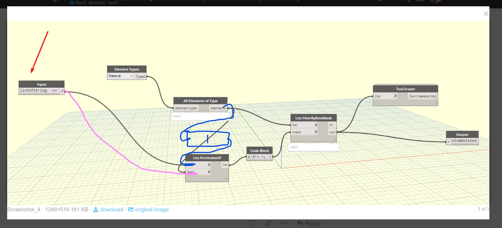 Firstly, you will need a ‘material.name’ node between your ‘allelementsoftype’ and the ‘list.firstindexof’ (where I have drawn the blue box) as you are inputting strings and trying to find materials.