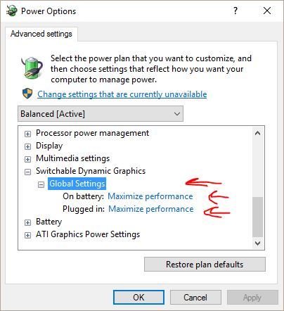 -Go to power options…change plane settings…change advanced power settings…switchable dynamic graphics… and then set - on battery and pluged in (maximize performance).