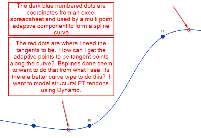 I am modeling structural PT tendons. The tendon must be located knowing exactly where the tangent point is, and the tendon must flow through that point. I have created an adaptive component which has multiple points connected by a spline through points and an extruded circle to create the tendon/cable. I intend to use a spreadsheet of x,y,z values to locate each point. When I do this the nurbscurve and extrusion do not necessarily flow through the points at tangents. What process can I use to do this?