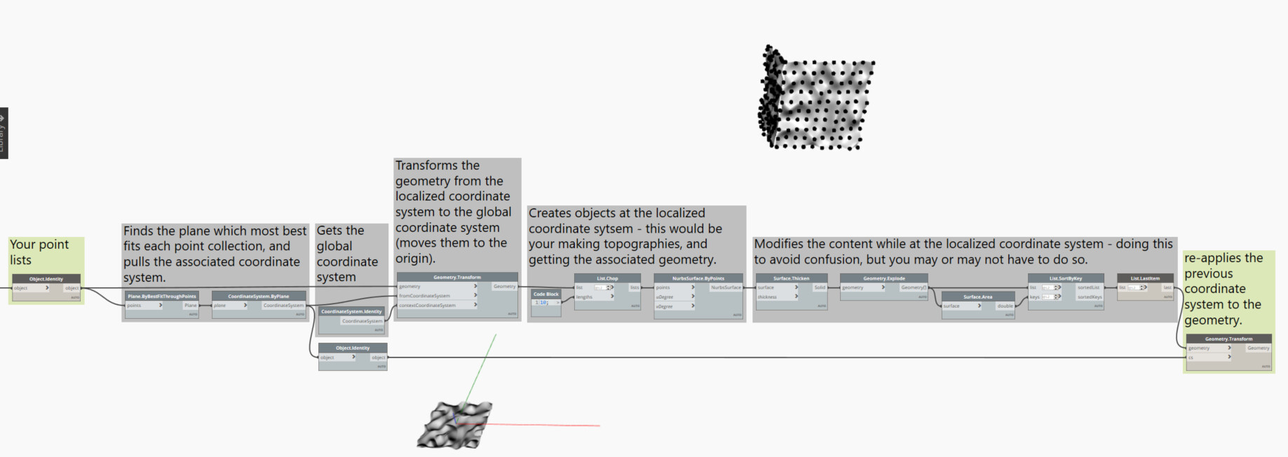 So I notice that these points will be really hard to chop up into rows of data that will always make sense, in order for the nurbs surface to work. However, I noticed that the topography node seems to work perfectly and then I can convert it to a surface without having to chop up the list of points. This is exactly what I need, but it also breaks down when I try to do a vertical surface. Is there a way to translate the geometry to make the topo node always work even in vertical orientations?