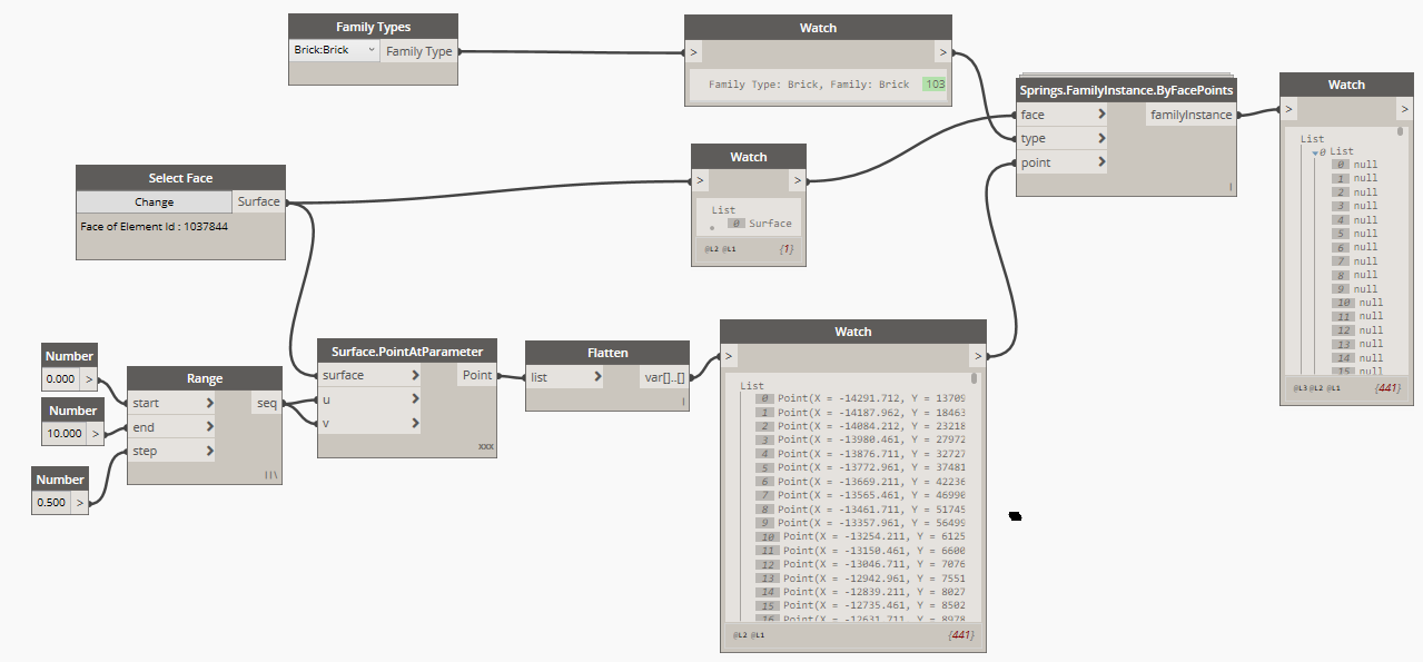 Essentially, I’d like it for the user to select a face - possibly a wall or the face of a generic mass - the routine would then place points over the face in rows and columns spaced at certain distances - I’ll then use these to place bricks.
