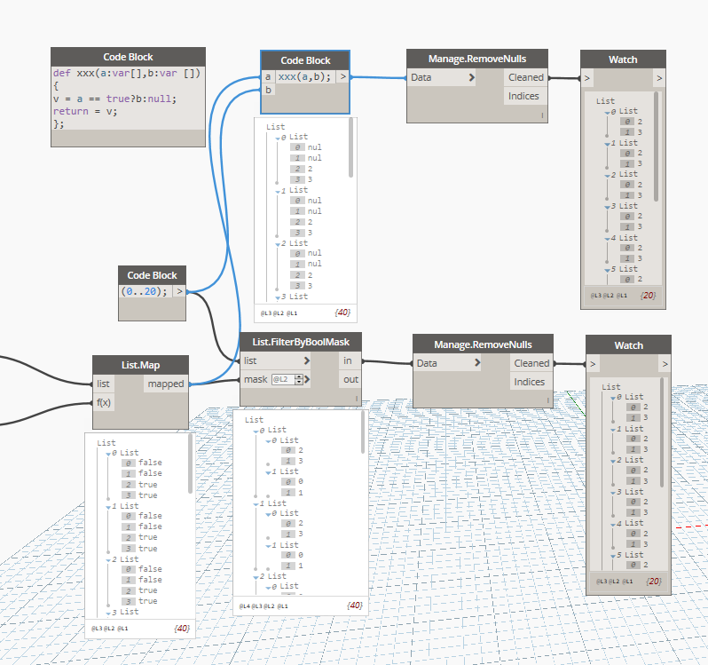 Hi all,I’ve been trying to convert the true values of a list by a numeric values from other list and remove the false values also. I’ve been using design script which was posted long back. But it is not working. Where I did wrong? or any other solution.