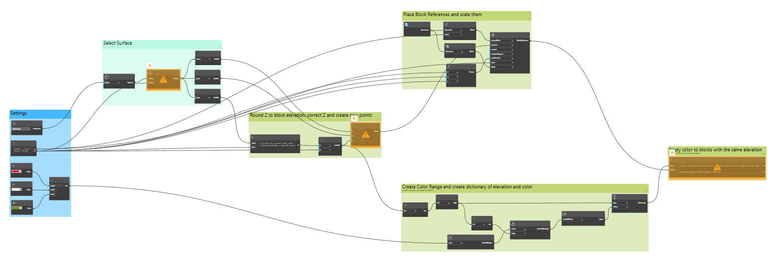 The Surface is resampled to the grid size, this results in a list of points. The Z value is rounded to an elevation that corresponds with the block height. Then the blocks are placed on these points and scaled to the grid size (this is why 1x1x1 is a perfect definition size). After that the bricks are colored according to the elevation. A dictionary is used for that.