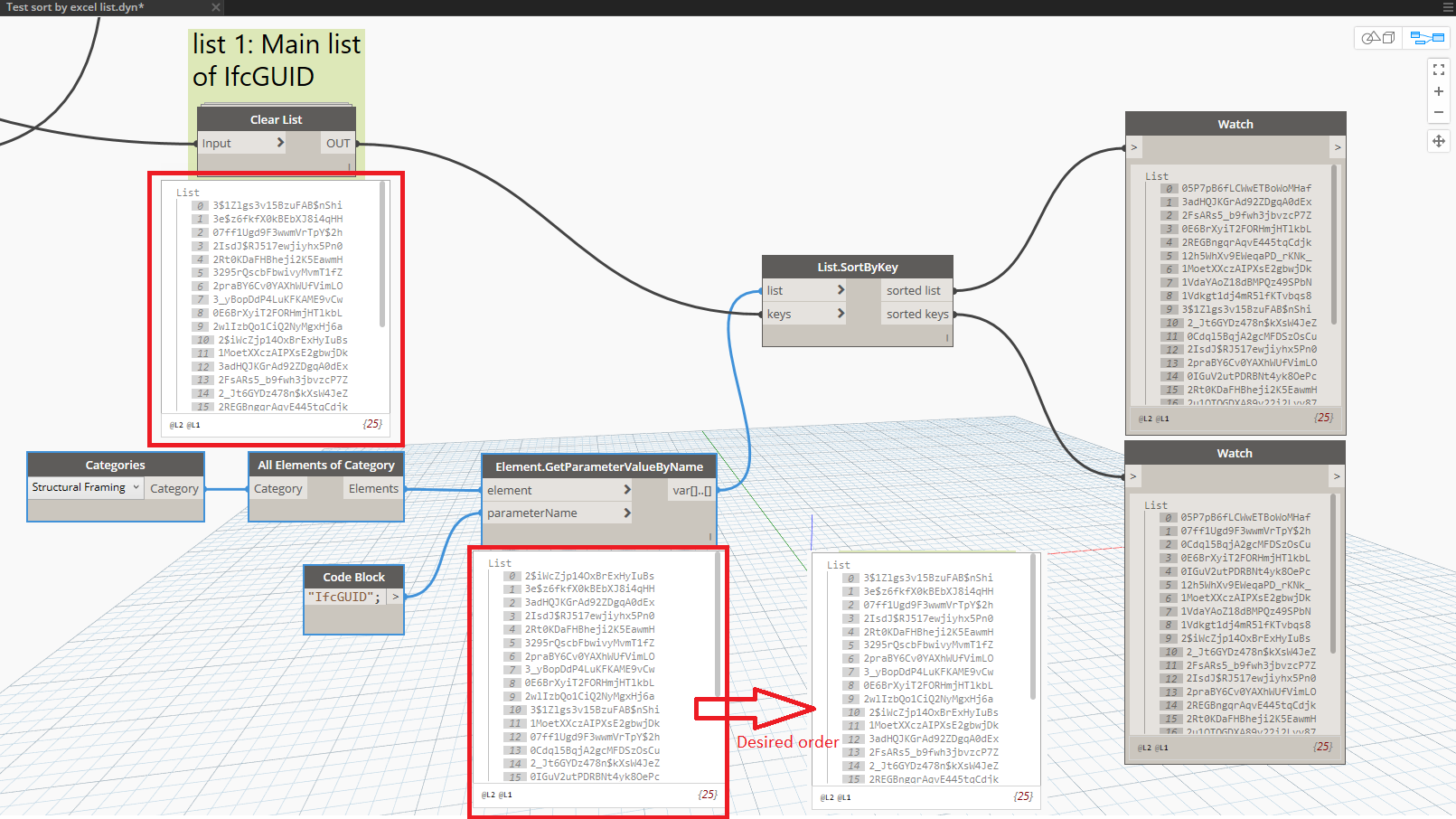 I tried the List.SortByKey before in this script, but the node will sort its keys and the list alphabetically. I am trying to sort the IfcGUID elements in my project in the same order as the Excel list.