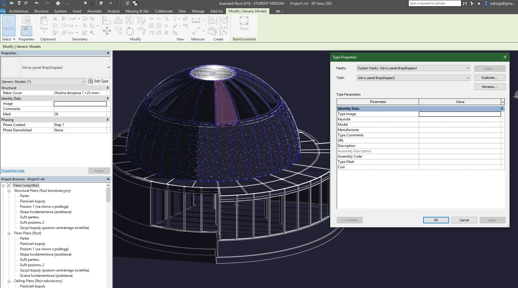 Figure A - I have made panels for my dome by using Spring Nodes package - Springs.BrepShape.ByGeometry. It worked and gave me panels in Revit placed in correct space and with correct material - what is shown in the figure B.