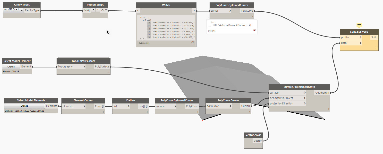 I am selecting model lines to create polycurves projected on the toposurface - that can be the path for the sweep. And I coverted the profile for the sweep to a polycurve to be used as profile.
